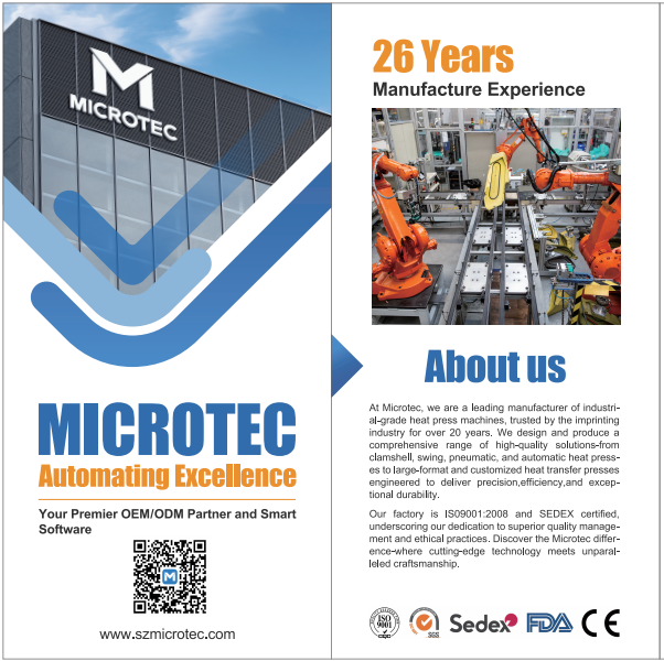 Фабрика Microtec занимает более 28,000 квадратных метров и насчитывает более 280 сотрудников. На фабрике имеется 6 цехов для производства термопрессов, включая интегрированное фрезерование с ЧПУ, сварку, формование металла, электропроводку, изготовление, сборку и упаковку; 6 цехов для производства кружек сублимационного покрытия, включая очистку, туннельную сушку, автоматическое распыление, выпекание, контроль качества и упаковку; 2 цеха для производства принтеров DTG и УФ-принтеров. В качестве сертифицированной по ISO9001:2008 фабрики, наши продукты одобрены такими сертификационными агентствами, как CE, SGS, FDA и другими.